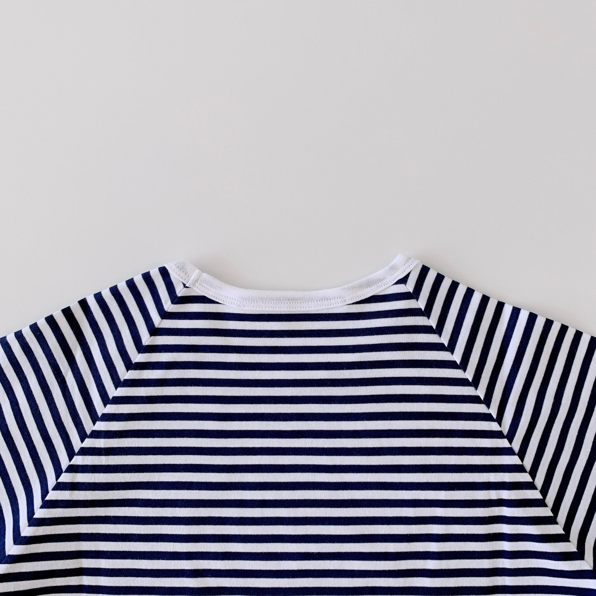 定番のボーダーカットソー。オリジナルのカットソー生地は滑らかな肌触りと洗濯にも強い丈夫な素材で、日常着として活躍します。程よい開き具合のクルーネックと、肩が張らずきれいに見えるラグランスリーブは、一枚ではもちろん、重ね着にもおすすめです。
