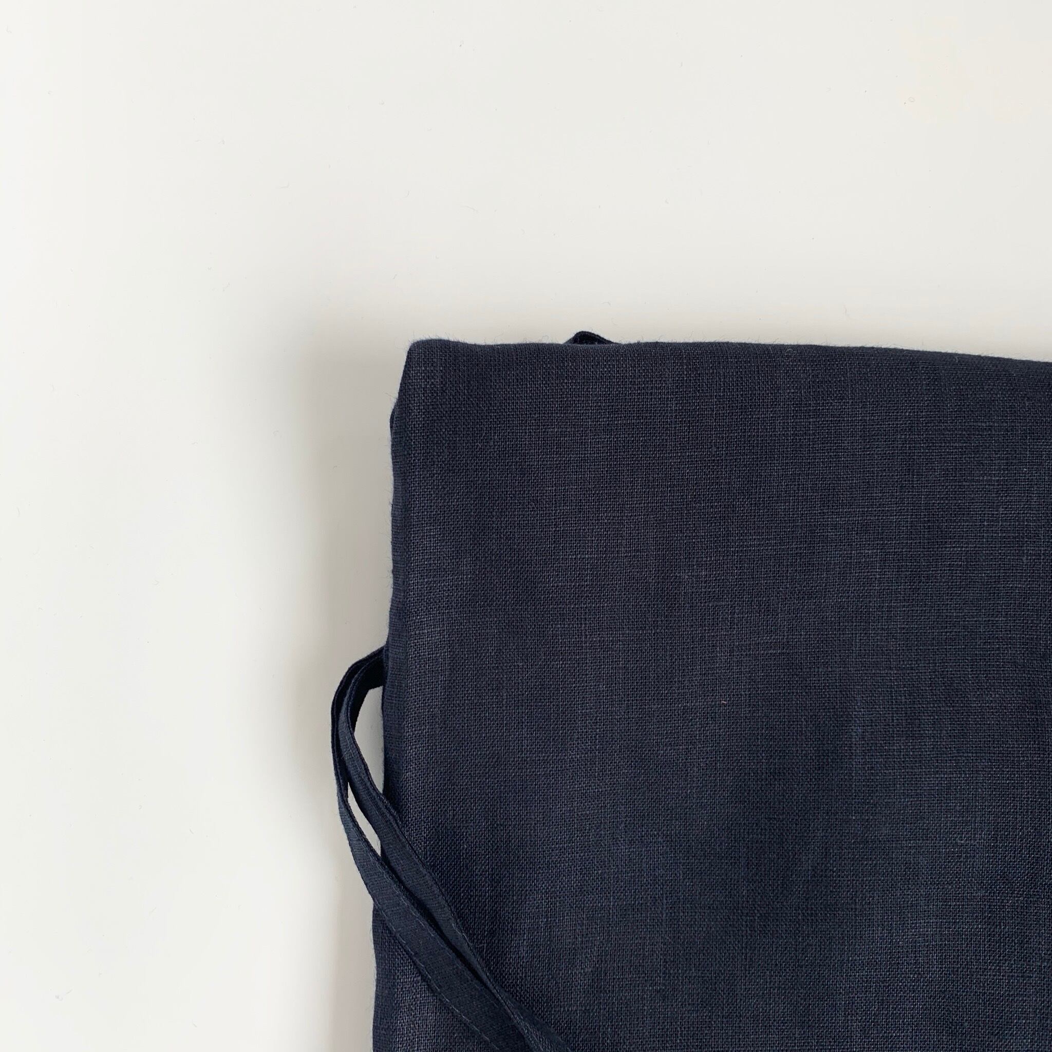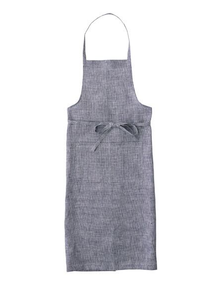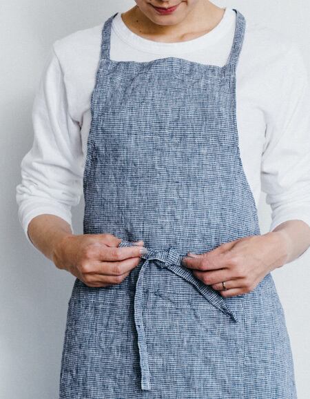 普通地を使用しているので、胸当ての部分を内側におりこんで、サロンエプロン風にも使えます。胸元にテープのフックがついているので、使った後はキッチンに吊るしておけるのも便利です。リネンは天然素材の中でも特に丈夫な生地。 繊維の中が中空になっていて水分を吸湿・発散しやすいため、吸水性に優れ、乾きが早いのが特徴です。エプロンが汚れてしまっても洗濯機に入れて洗っていただけるので、ザブザブ洗って、ノーアイロン。いつでも清潔なエプロンをご使用いただけます。 落ち着いたネイビーは引き締まった感じ、汚れも目立たず便利なお色。